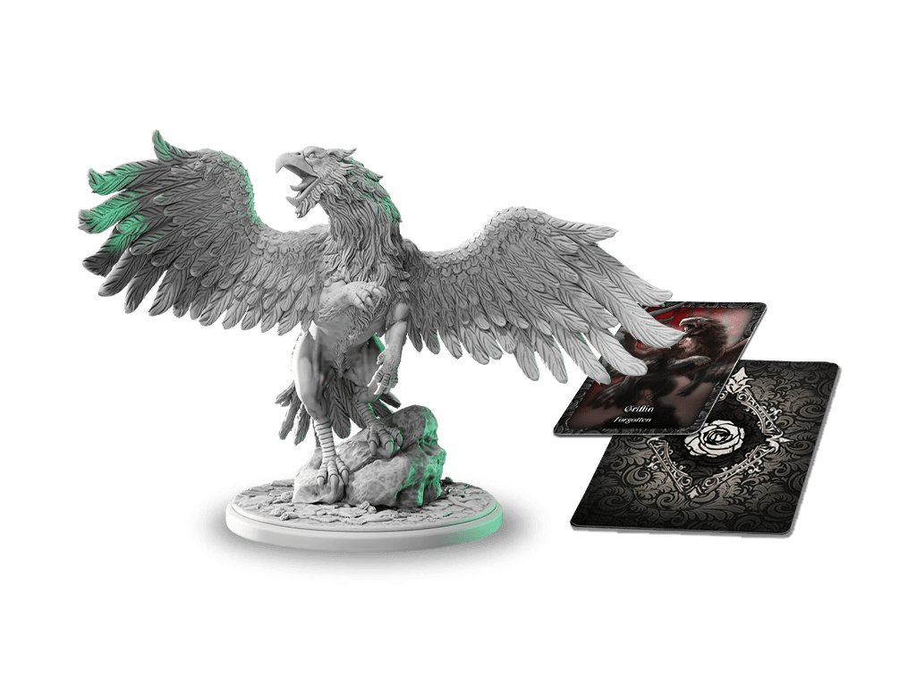 Box content: Griffin miniature (55 mm), Cassandra miniature (40 mm), Cacus miniature (100 mm), Parcae miniature (65 mm), 5 Silvano miniatures (30 mm), 2 Avatar Cards, 60 Command Cards, 3 Forgotten Spell Cards, 3 Personal SPell Cards, 9 Evocation Cards, 1 Mage Card, 36 Spell Cards, 1 Reference Card, Ludus Magnus Arena Room, 1 Activation Token, “Thread of Fate” Legendary Scenario.