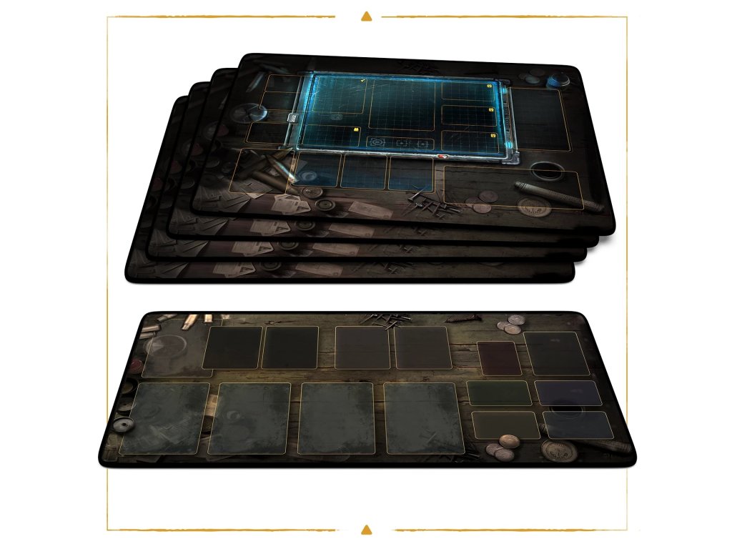 Four playmats for each Stalker's player board + one universal mat that acts as an organizer for different decks and components you need to keep close by when playing the game.